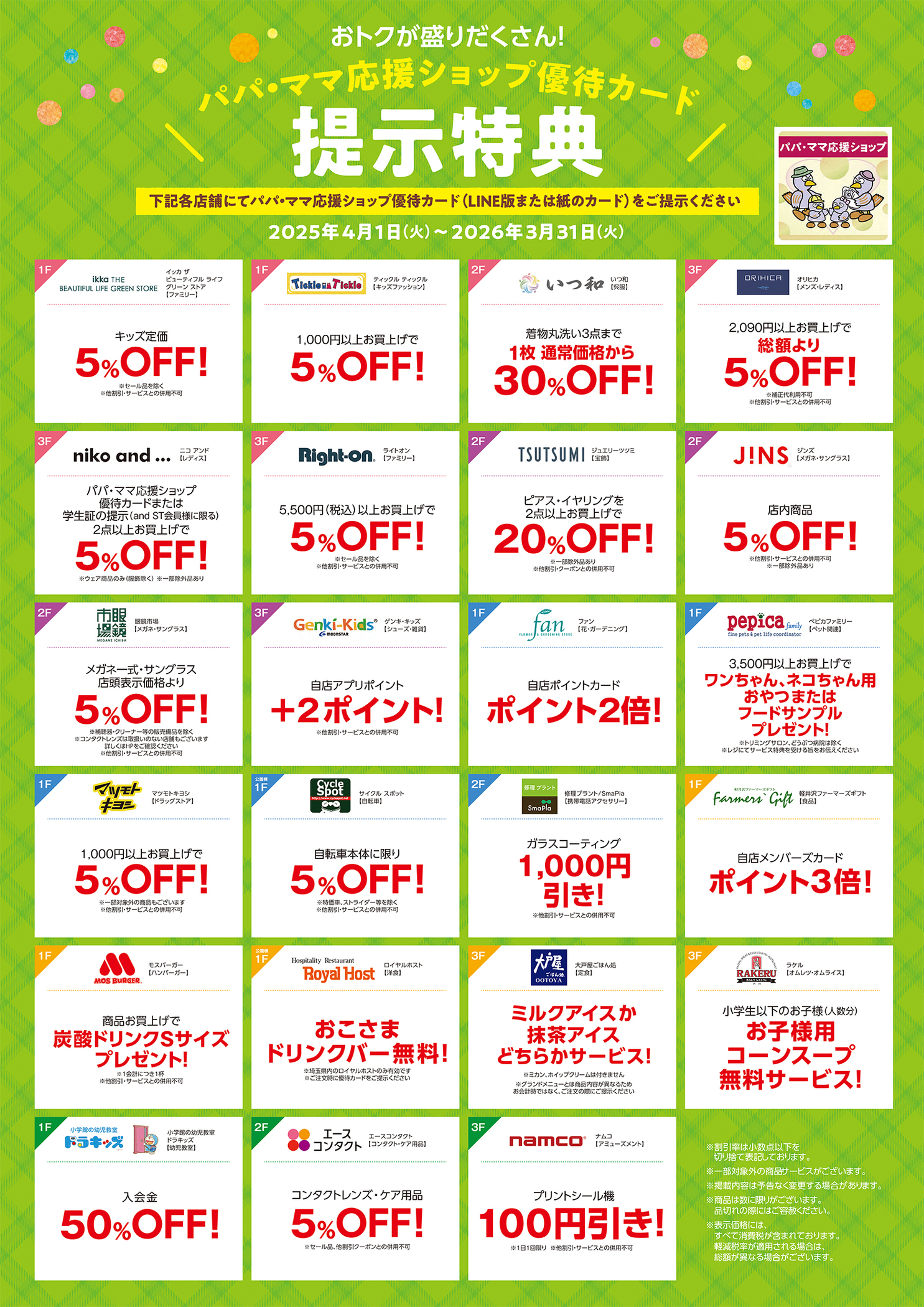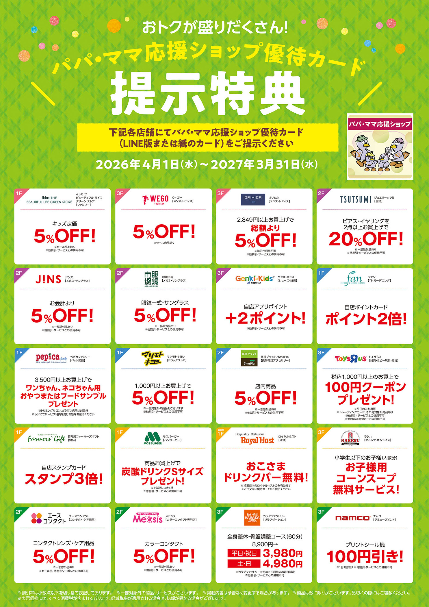 ステラモール内の店舗にて、パパママ応援ショップカードの提示優待を開催中!