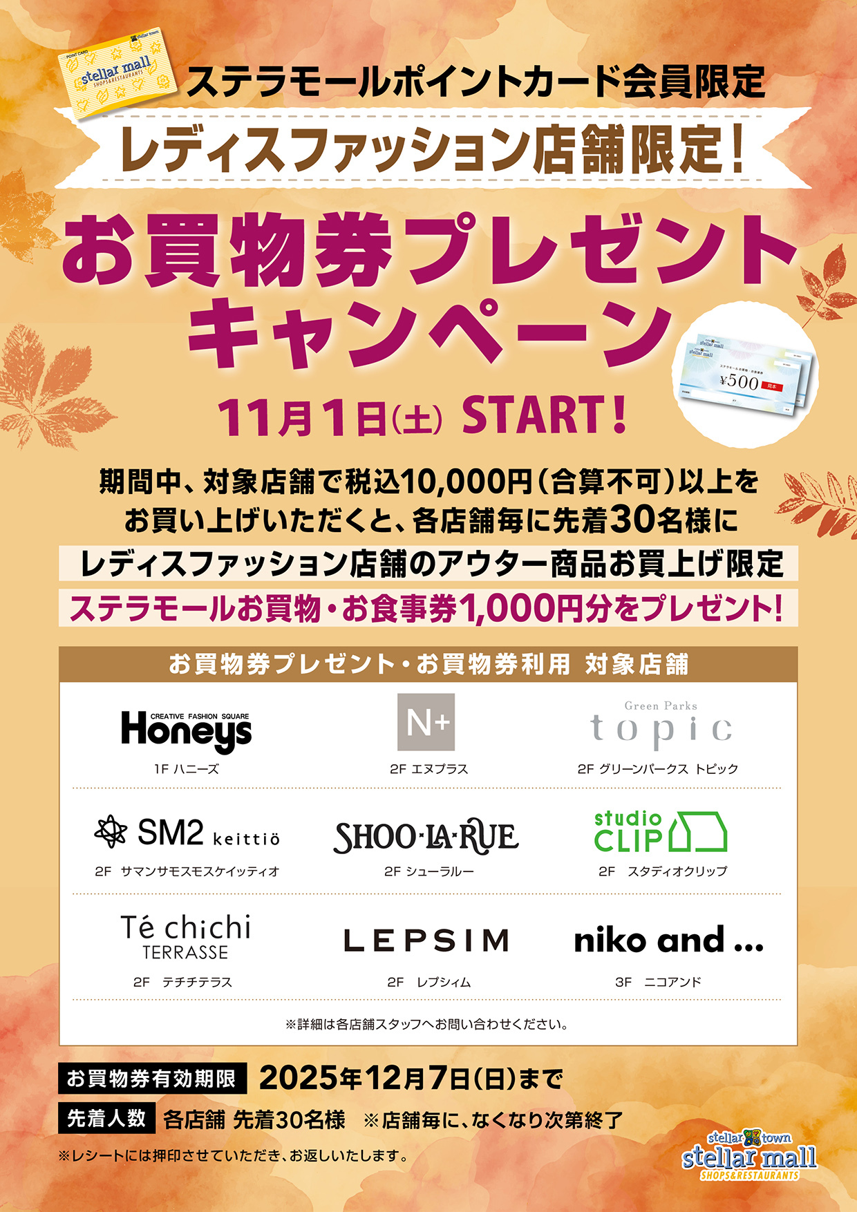 - 11/1(土)~ レディスファッション店舗限定!お買物券プレゼントキャンペーン!