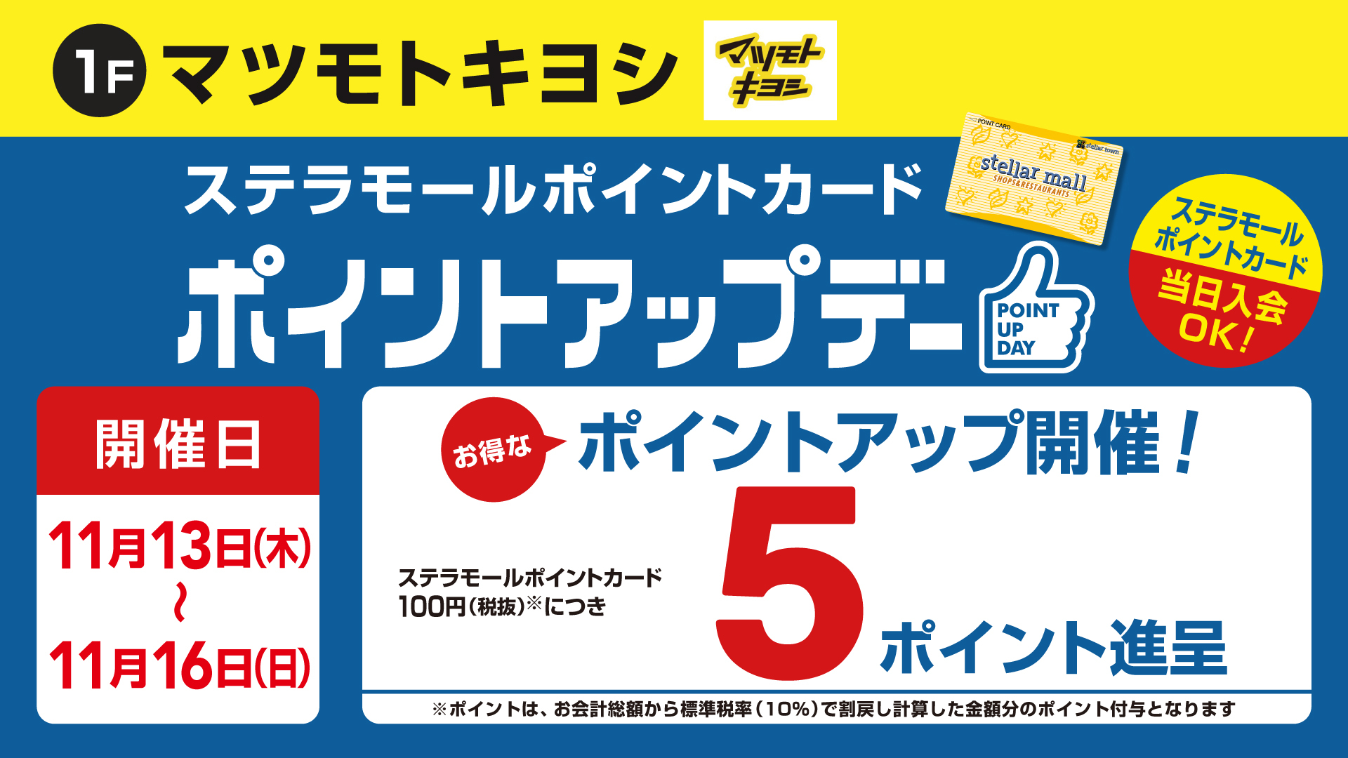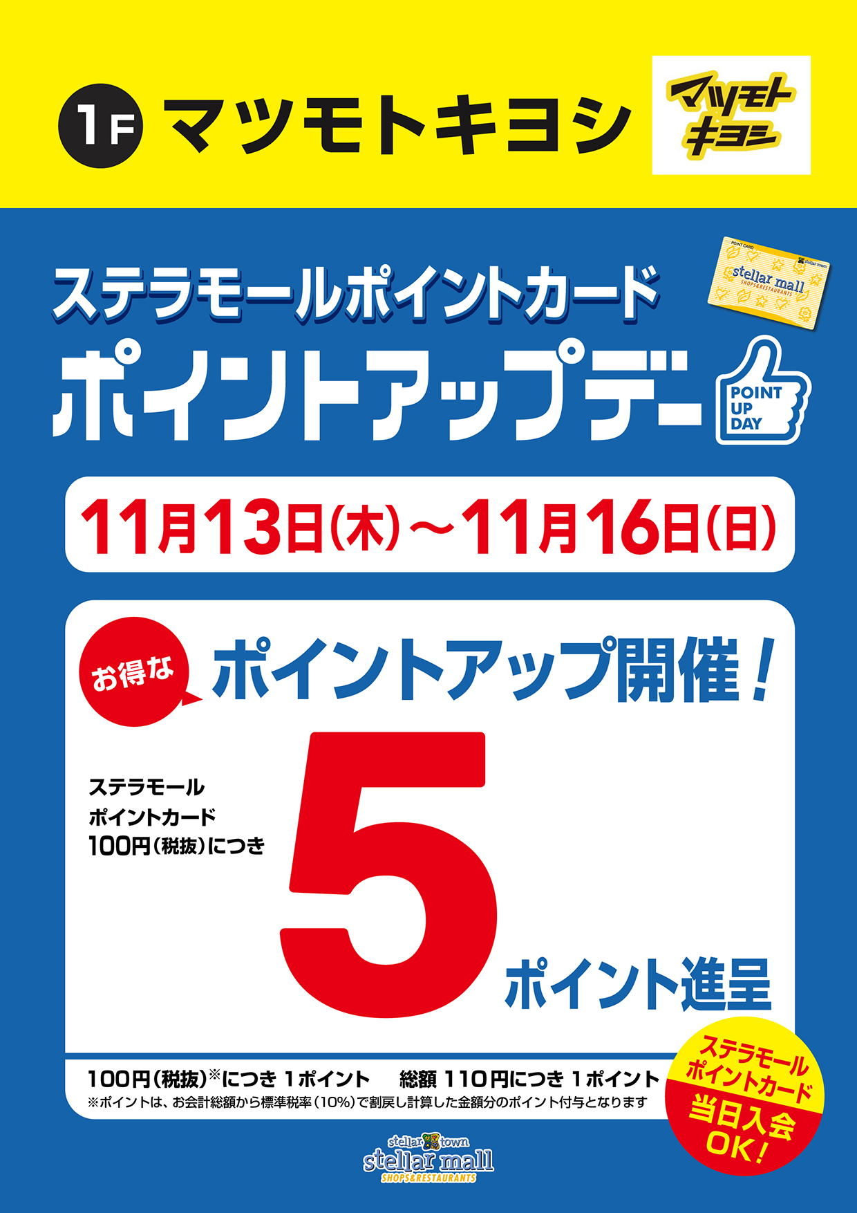 - 【マツモトキヨシ】11/13(木)~11/16(日) ステラモールポイント5倍!