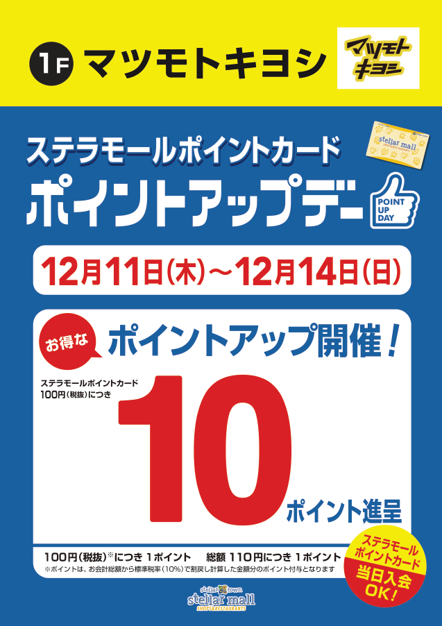- 【マツモトキヨシ】12/11(木)~12/14(日)ステラモールポイント『10倍』!