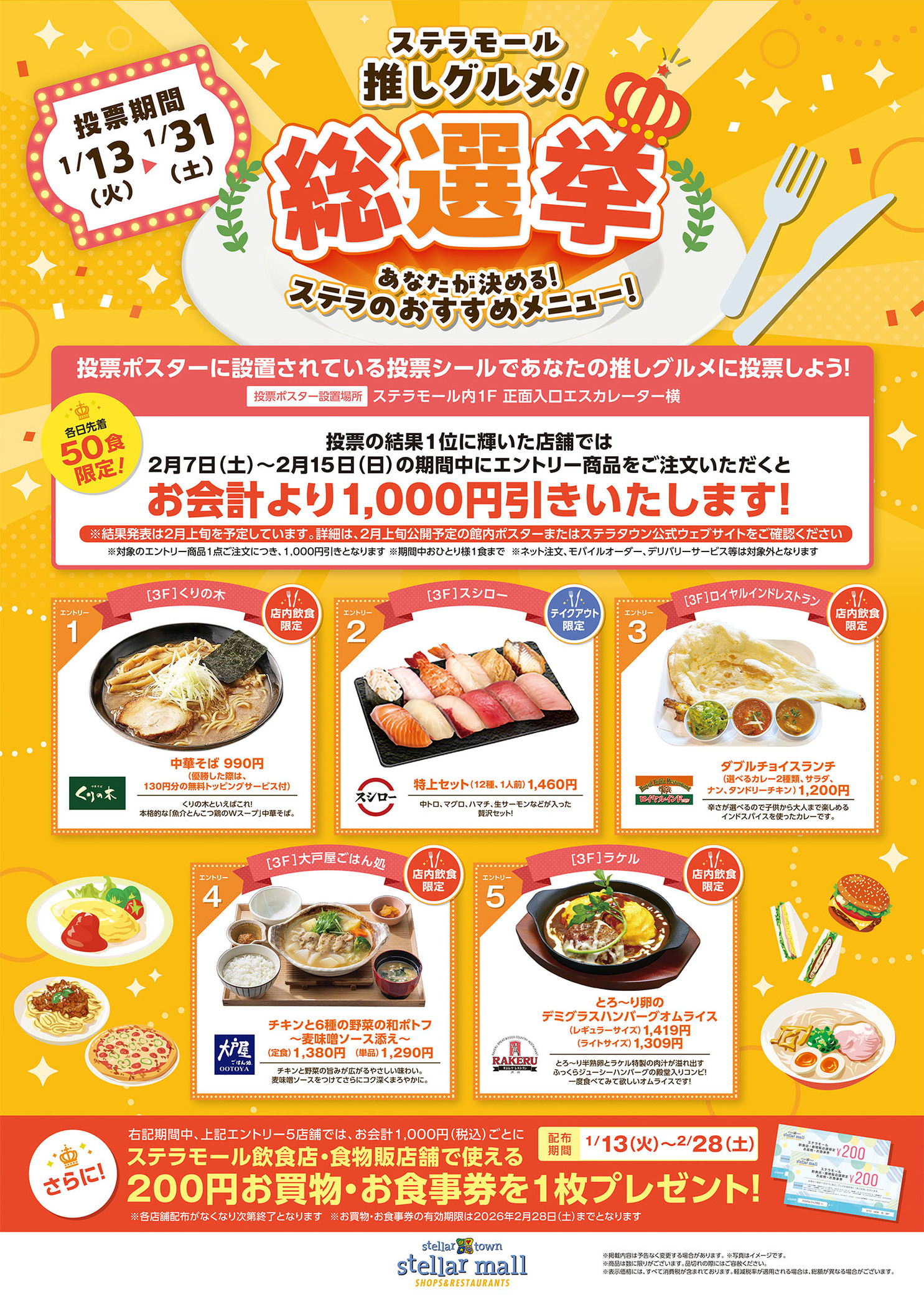ステラモール飲食店・食物販店舗で使える “200円お買物・お食事券” を1枚プレゼント!