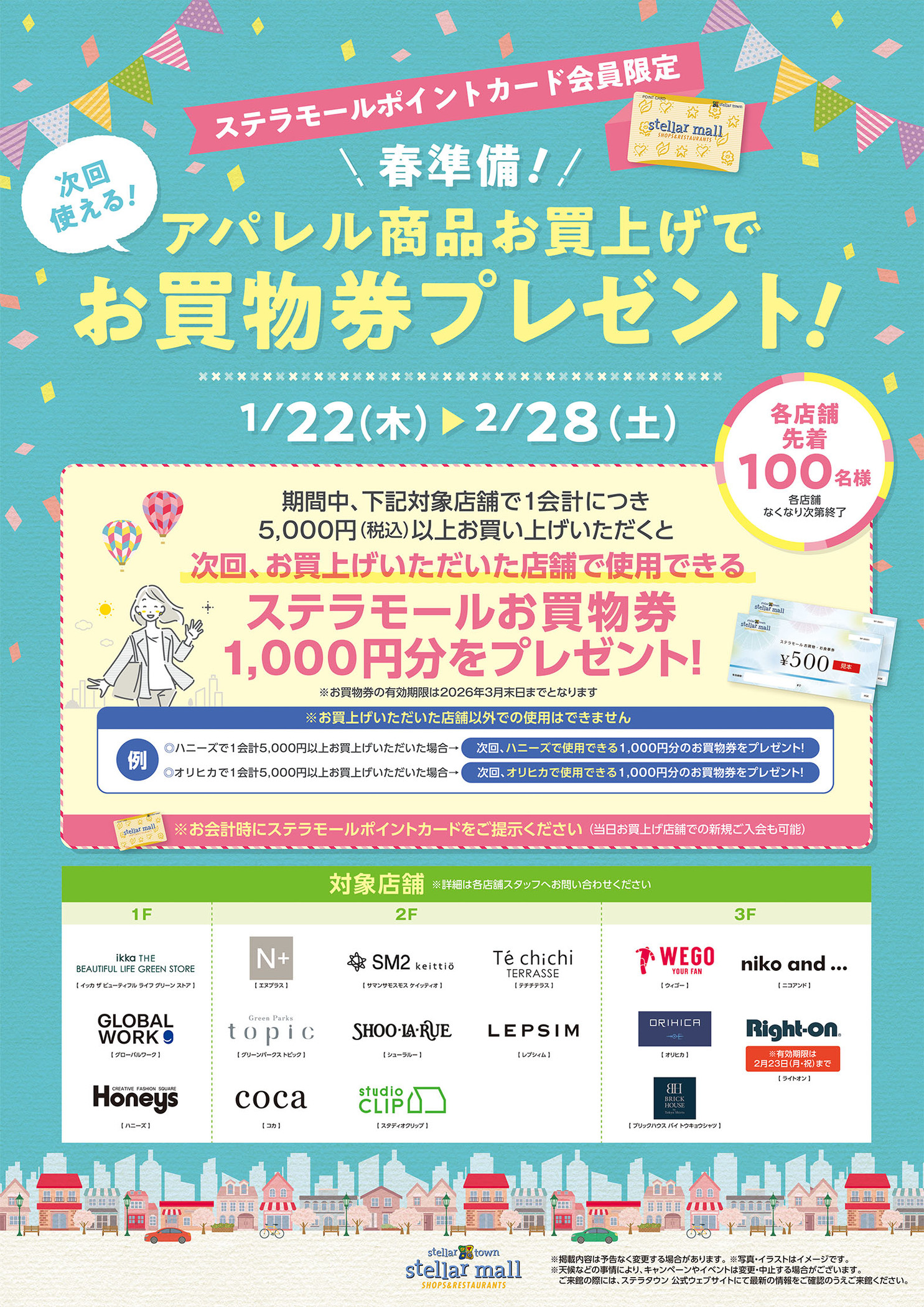 - 春準備!次回使える!アパレル商品お買上げで、お買い物券プレゼント!