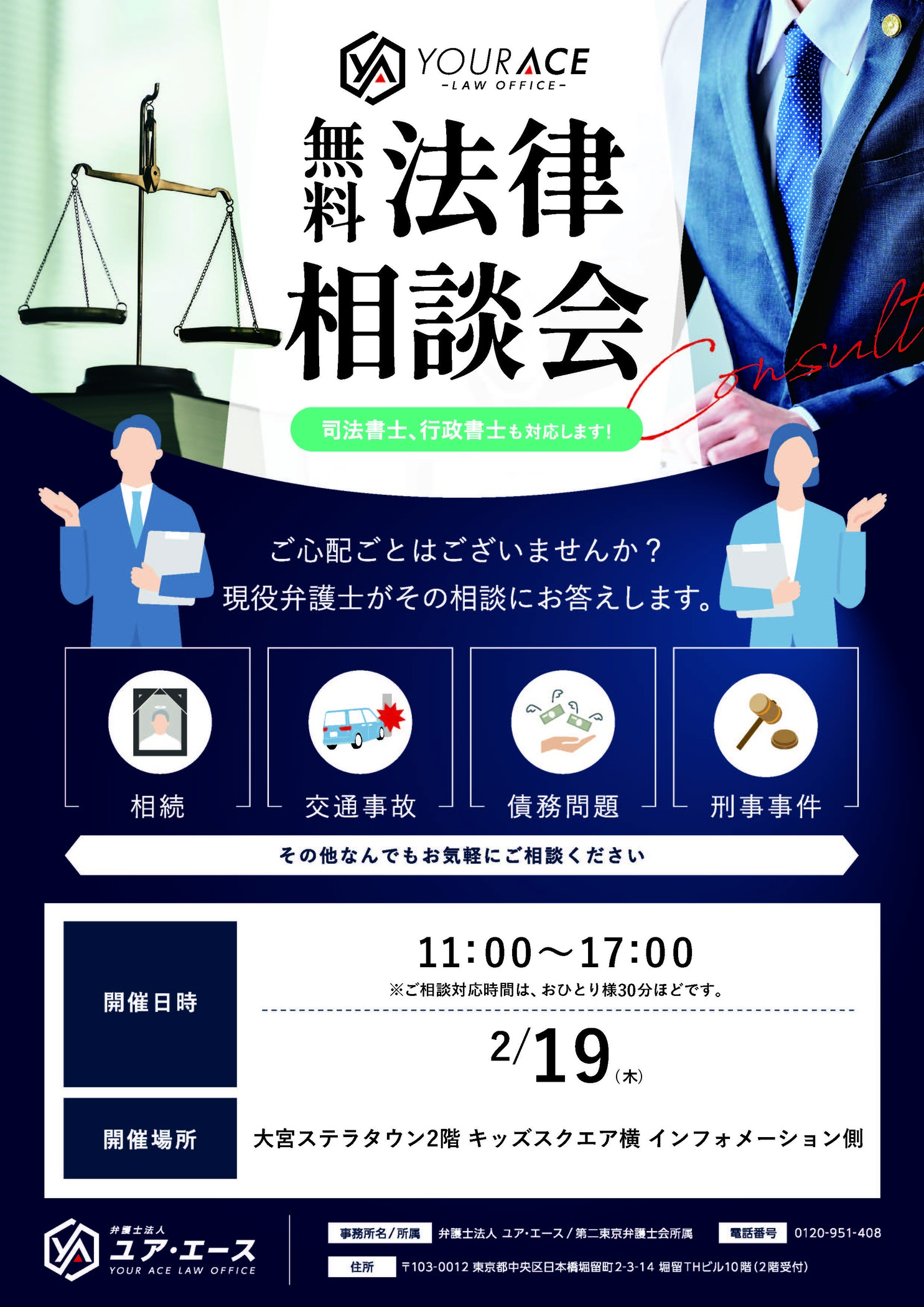 弁護士法人ユア・エースの弁護士、司法書士、行政書士が、地域の皆さまのお悩み解決をお手伝いするために、無料法律相談会(約30分)を開催いたします!