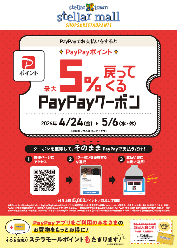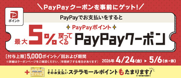 - PayPayポイント最大5%戻ってくるクーポン発行中!