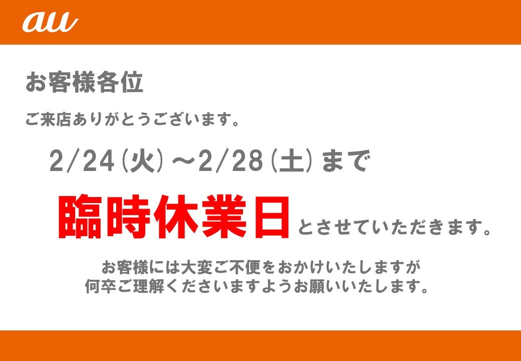 【お知らせ】auショップ 臨時休業について 2/24(火)~2/28(土)