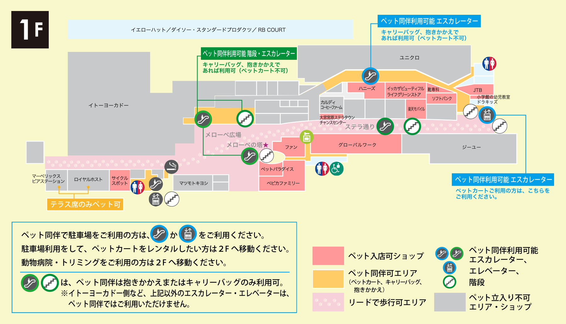 ステラモール側のエスカレーター、エレベーターはペット同伴でも利用可能です。ご利用時は周囲の方へ配慮いただきますようお願いします。