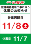 - 11/7(金)設備機器更新工事に伴う休業のお知らせ