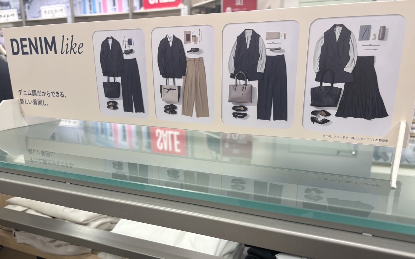春の新作、デニム調のジャケット、スラックス、スカートの
