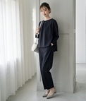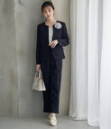 王道のネイビーでフォーマル感を高めるウォッシャブルキーネックジャケットとウォッシャブルワイドパンツ。